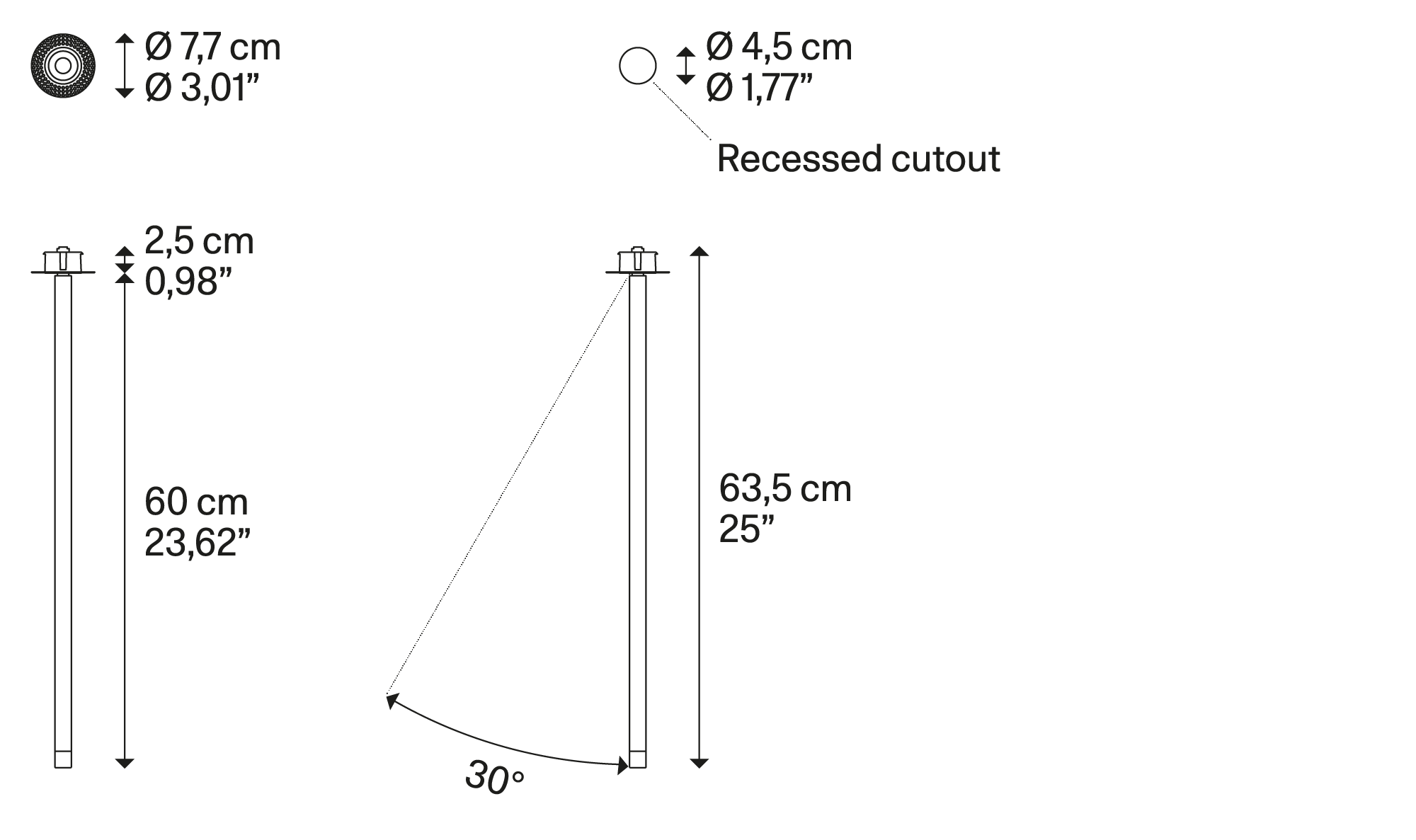 In the ceiling-recessed version, A-Tube Nano allows for the light beam to be directed at will, thanks to the joint angle of the lamp body, which enables the thin aluminium structure to be easily adjusted by up to 30° to direct the light onto specific details or emphasise the scenic effect of a composition with multiple elements.