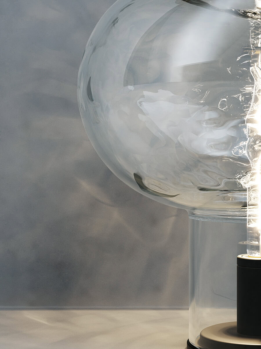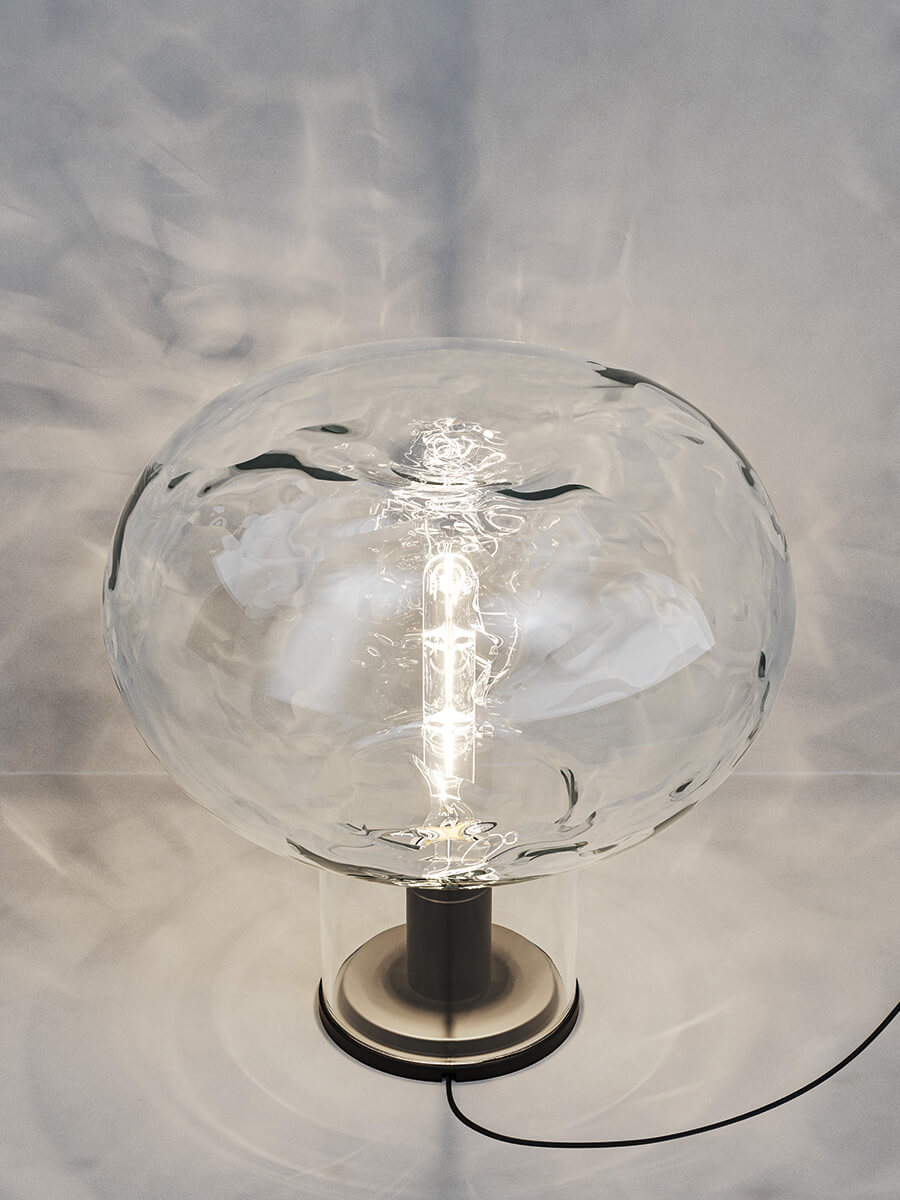 L’oggetto trova un’interpretazione contemporanea grazie all’effetto ottico psichedelico a cui rimanda il suo diffusore. L’effetto trasparente del diffusore è realizzato con un vetro dalla superficie irregolare che, grazie al suo aspetto liquido, crea l’illusione del riflesso dell’acqua sulla parete grazie alla proiezione della luce filtrata dal vetro.