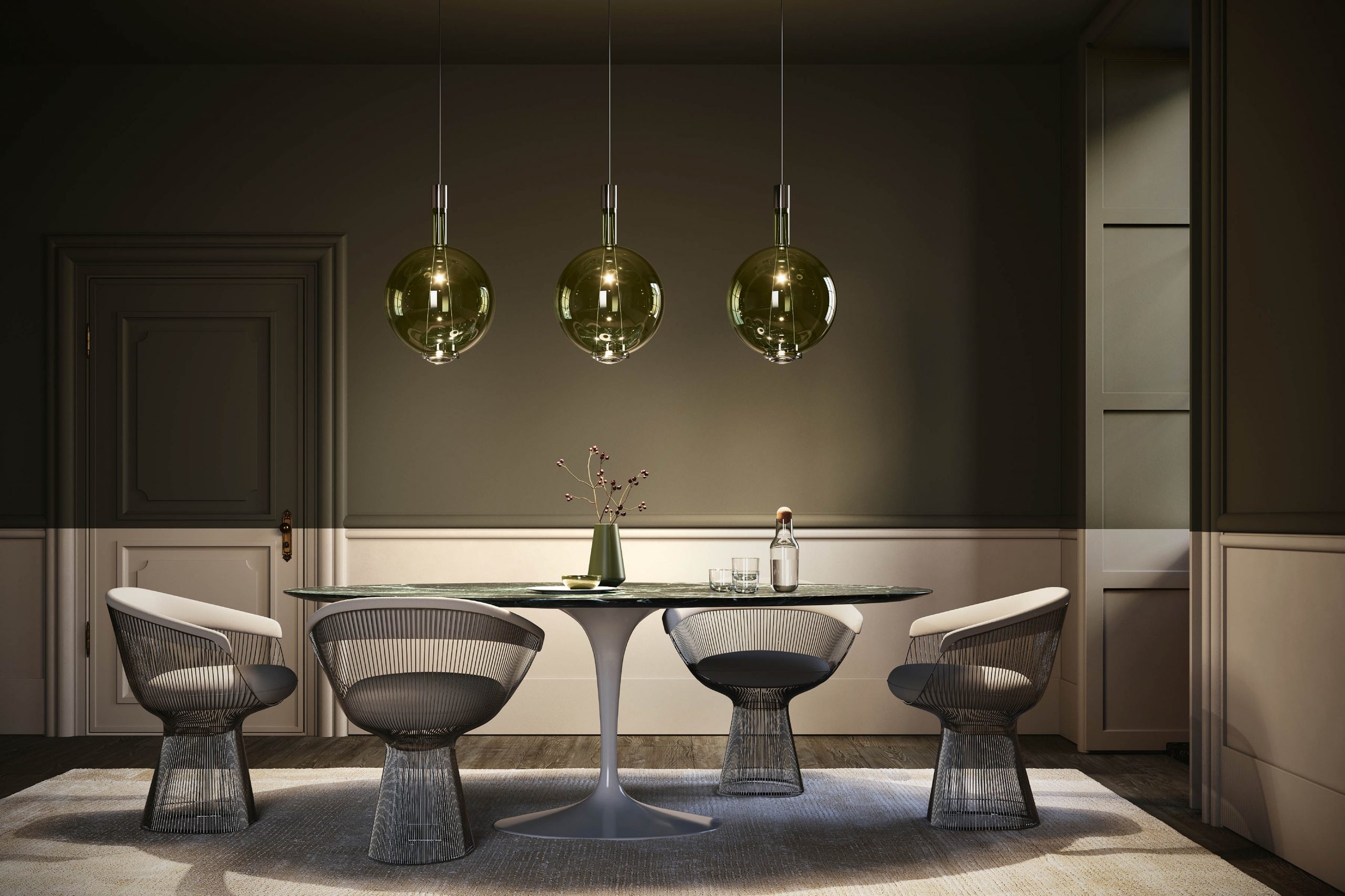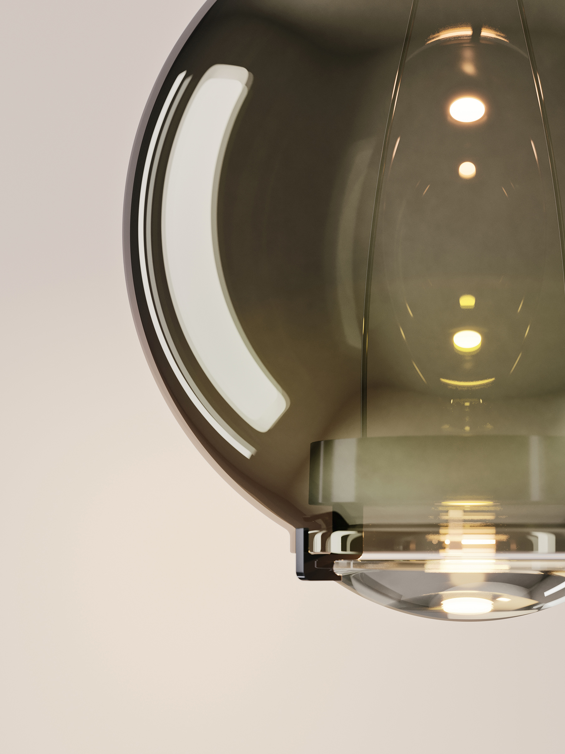 In Sky–Fall, the traditional glass processing techniques embrace the most advanced LED technologies. The shape of Sky–Fall captures the imagination in its reminiscence of ancient decanters in precious blown glass. Its function amazes thanks to the innovative double LED source that diffuses direct and indirect light. Available in two sizes and in four finishes, and in 2700 or 3000 K* light colour temperature versions, Sky–Fall decorates both when it is on and when it is off. Now added to the family is the new Sky-Fall Round: a further variant featuring a spherically shaped diffuser available in two sizes and four finishes, including the new, precious golden sage. The new finish also extends to Sky-Fall in both sizes.