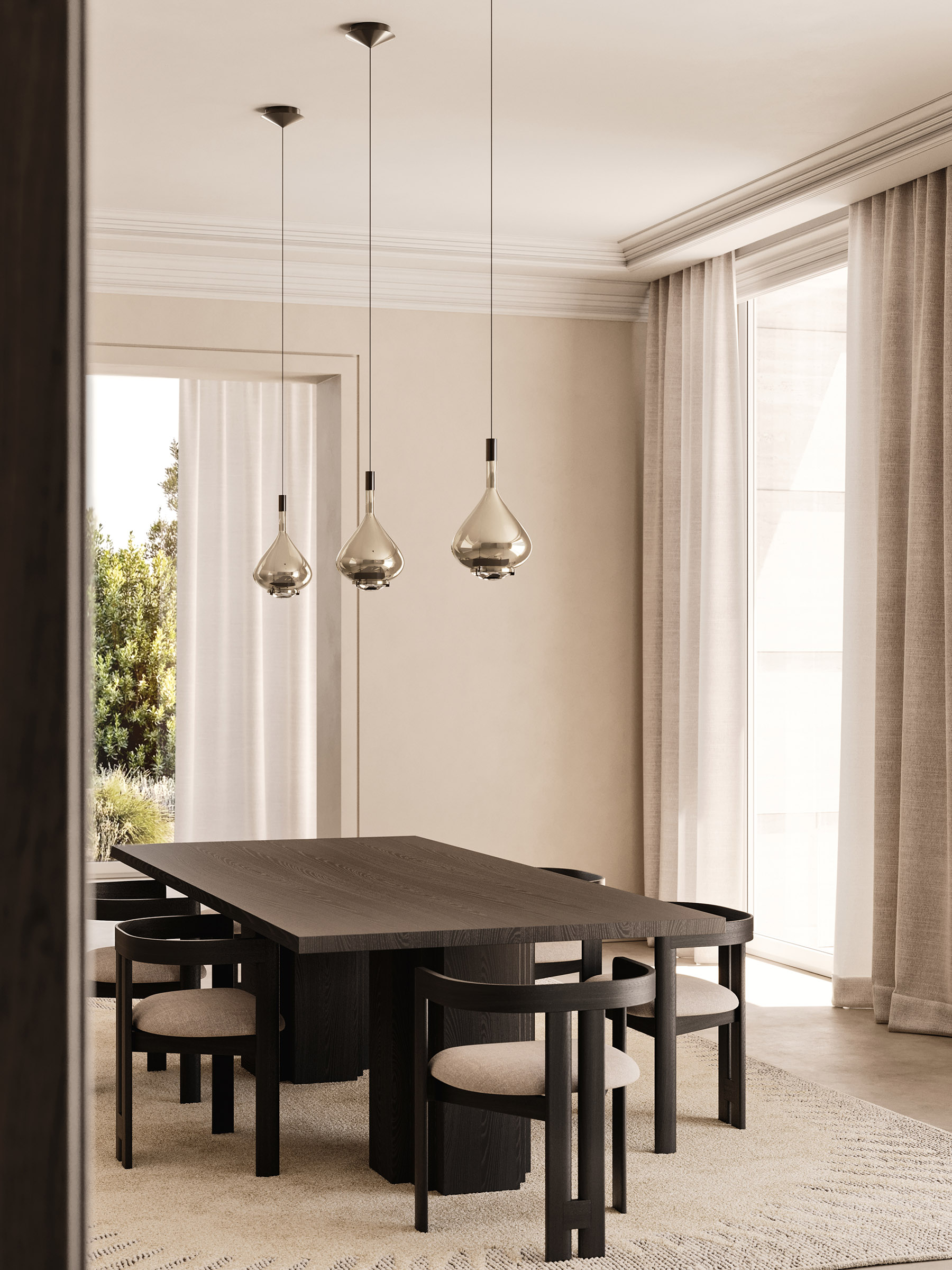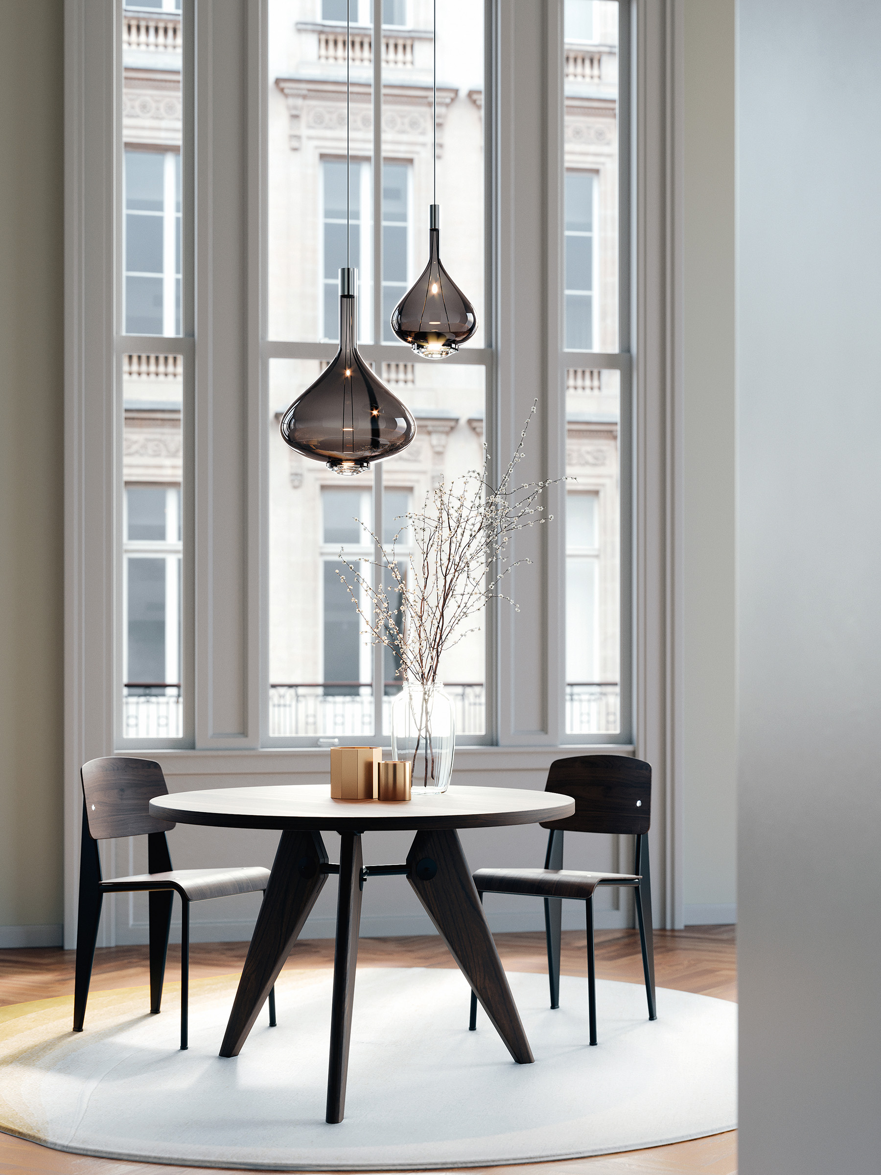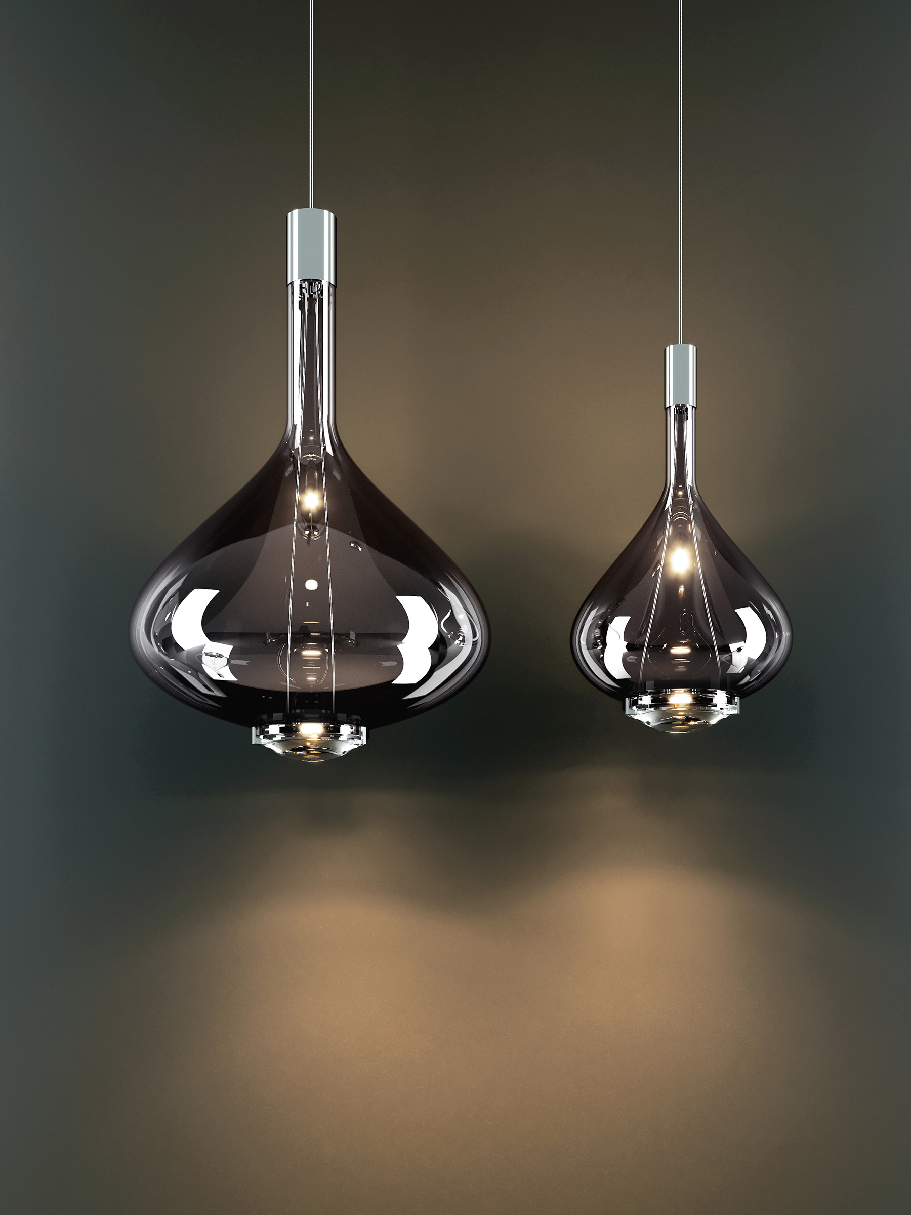 In Sky–Fall, the traditional glass processing techniques embrace the most advanced LED technologies. The shape of Sky–Fall captures the imagination in its reminiscence of ancient decanters in precious blown glass. Its function amazes thanks to the innovative double LED source that diffuses direct and indirect light. Available in two sizes and in four finishes, and in 2700 or 3000 K* light colour temperature versions, Sky–Fall decorates both when it is on and when it is off. Now added to the family is the new Sky-Fall Round: a further variant featuring a spherically shaped diffuser available in two sizes and four finishes, including the new, precious golden sage. The new finish also extends to Sky-Fall in both sizes.