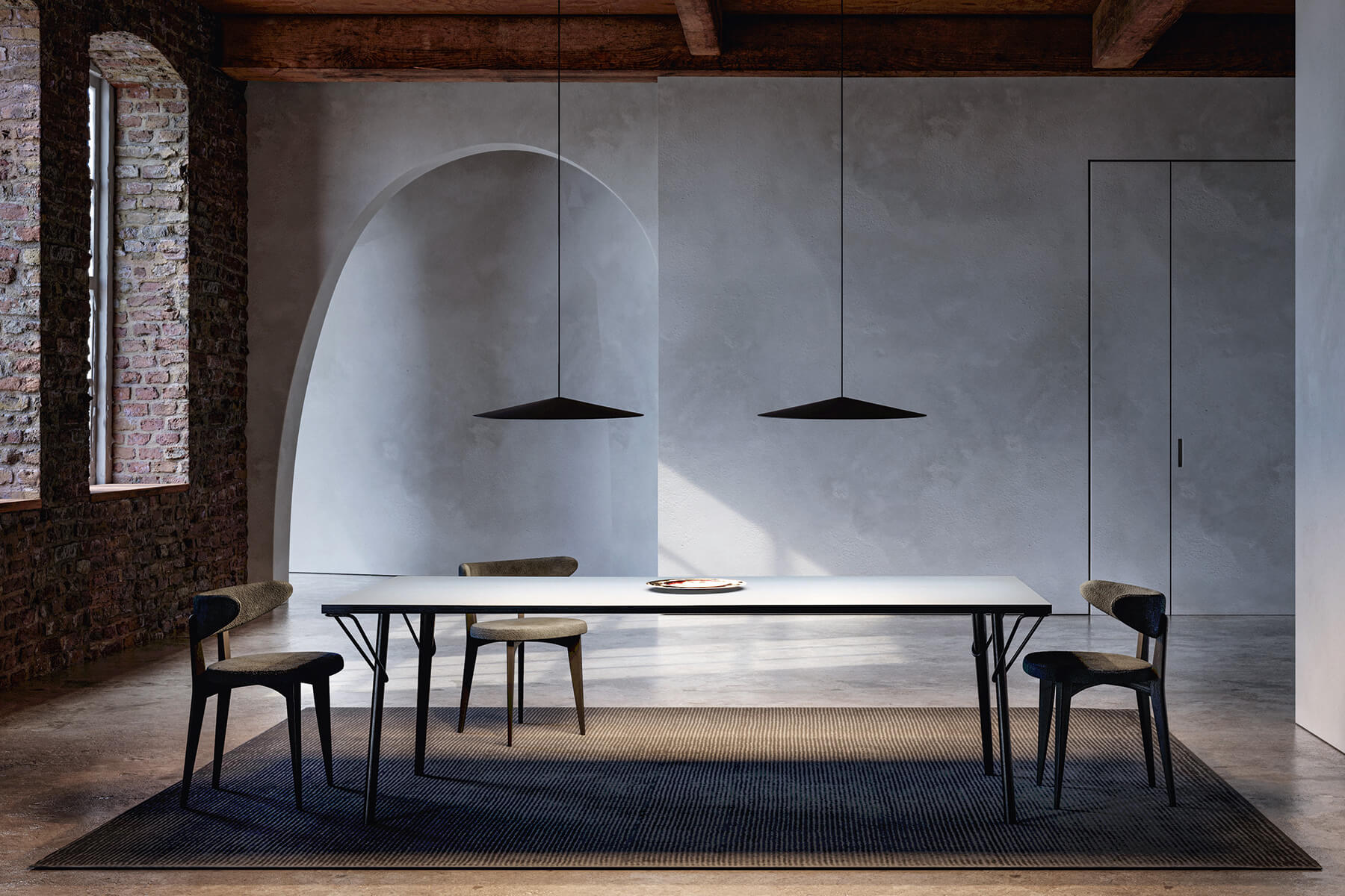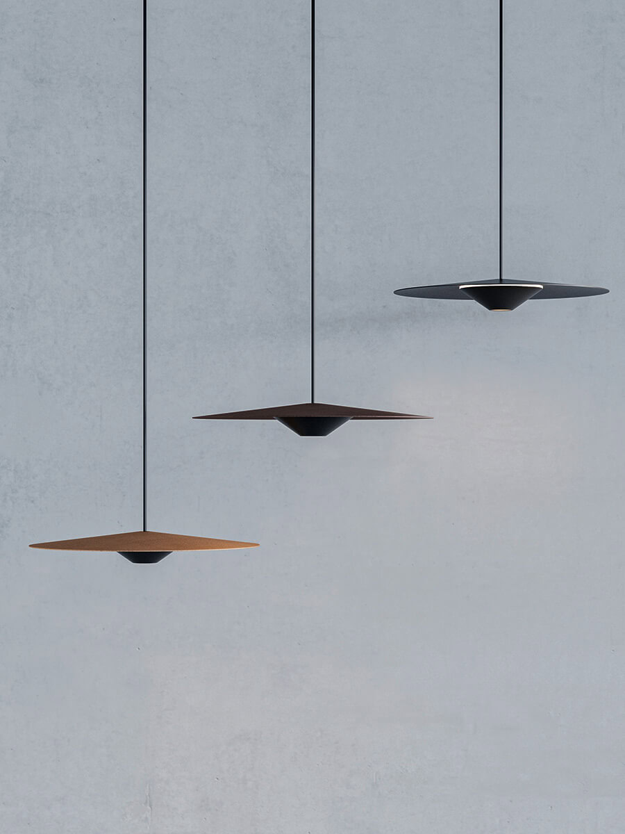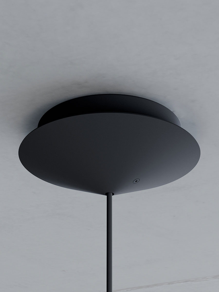 La lampada è caratterizzata da un diffusore di metallo largo e piuttosto schiacciato di forma conica, ma dallo spessore molto sottile che non occlude lo spazio, il LED proietta un fascio luminoso puntuale che diffonde la luce omogeneamente verso il basso.
