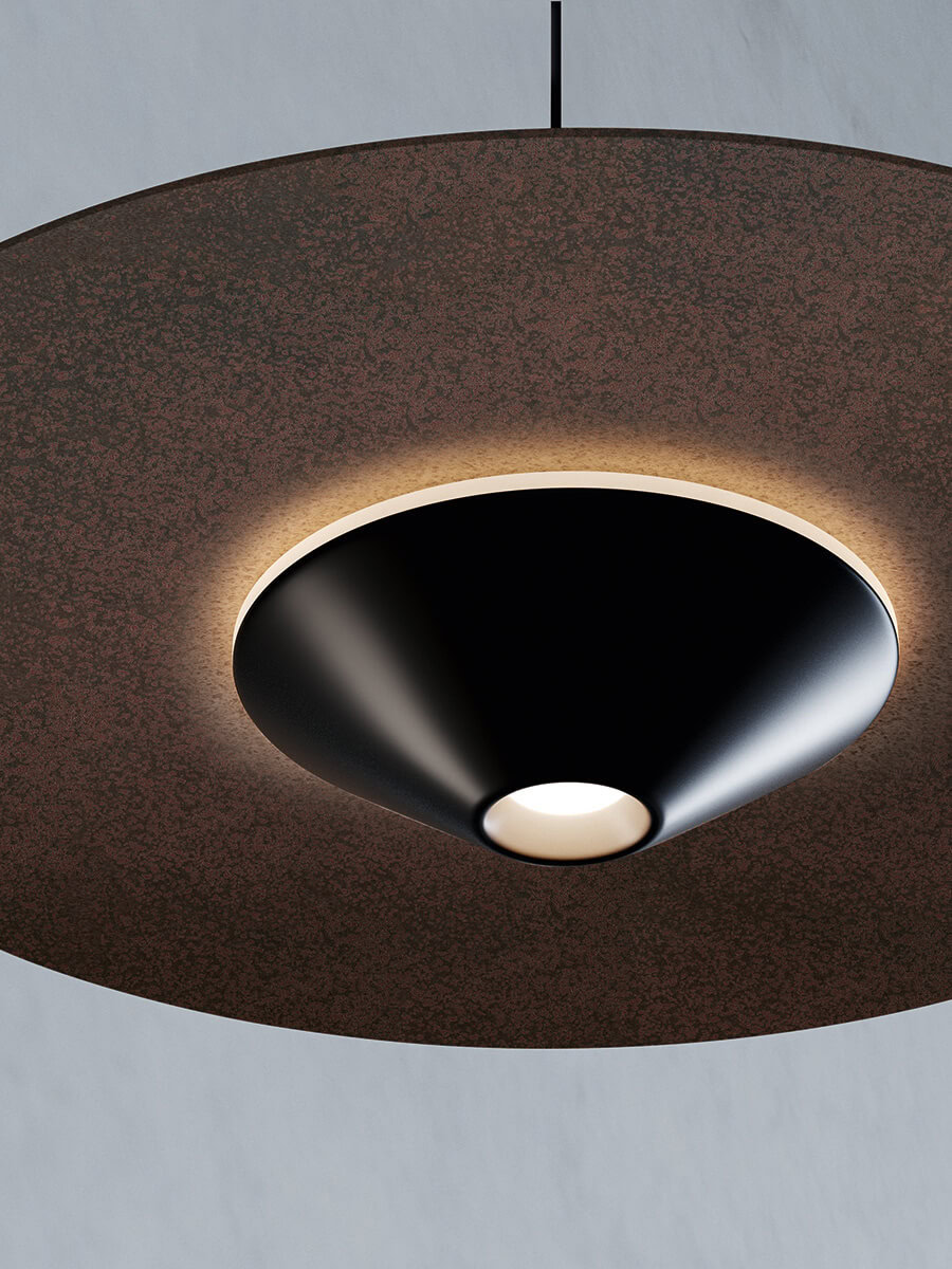 U.F.O. è disponibile in diametro 35 o 60 centimetri e nelle finiture Black, Rust e Sand. La fonte luminosa è disponibile nella versione 2700 K E 3000 K. La superficie del diffusore è caratterizzata da una finitura materica con una texture che richiama elementi come la ruggine e la pietra (per le finiture Rust e Sand).