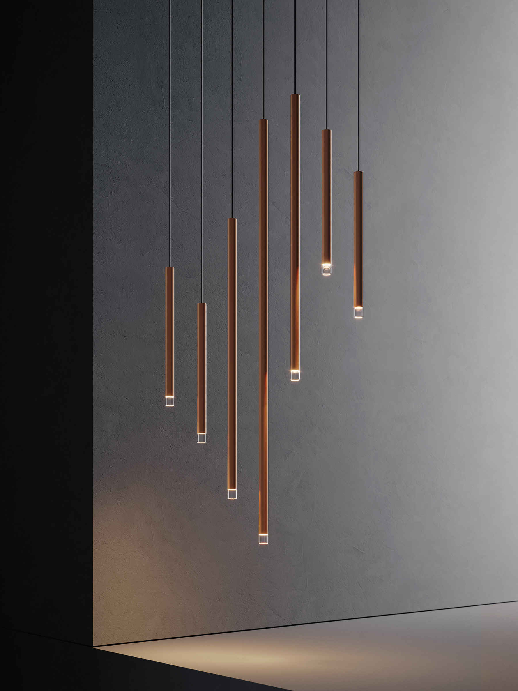 Elegantemente colgada al cable de alimentación, A-Tube Nano hace de la línea, signo gráfico esencial por excelencia, su fuerza intrínseca. Una esencialidad que abre muchas posibilidades de composición gracias a las tres dimensiones, small, medium y large, y a los siete acabados, brillantes (cromo, oro rosado, oro y tierra) u opacos (blanco, negro y champaña).