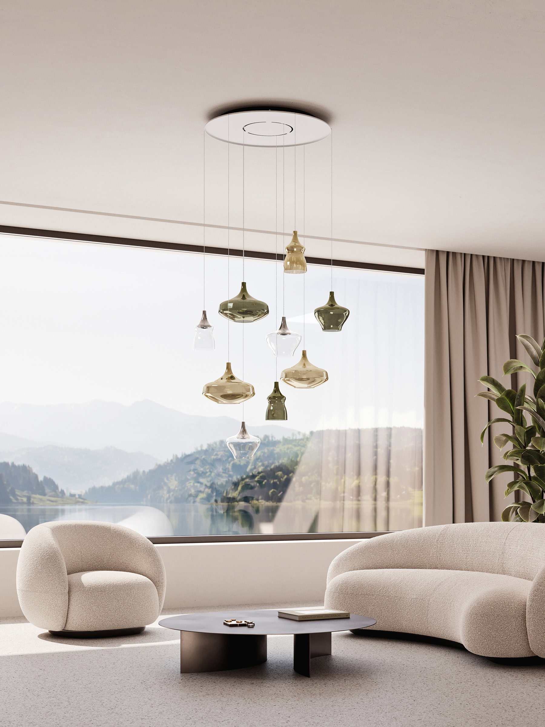 Gracias a seis refinados acabados que realzan la silueta del difusor y a dos opciones de cuerpo y cable, Nostalgia inspira soluciones luminosas y decorativas que transforman la percepción de los ambientes: desde el dormitorio hasta la cocina, pasando por la entrada de un hotel o un restaurante hasta las prestigiosas zonas de estar, establece con cualquier espacio un fascinante diálogo de reflejos fluidos y vibrantes, tanto si se instala sola como en poéticas composiciones en cluster.