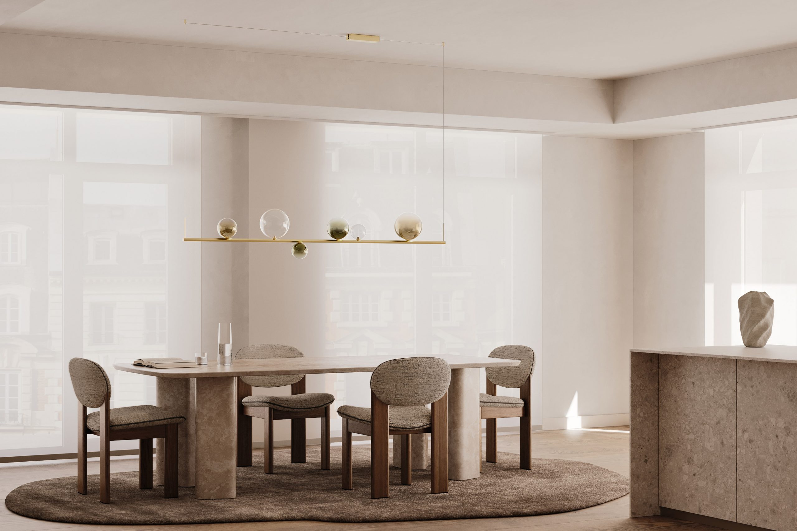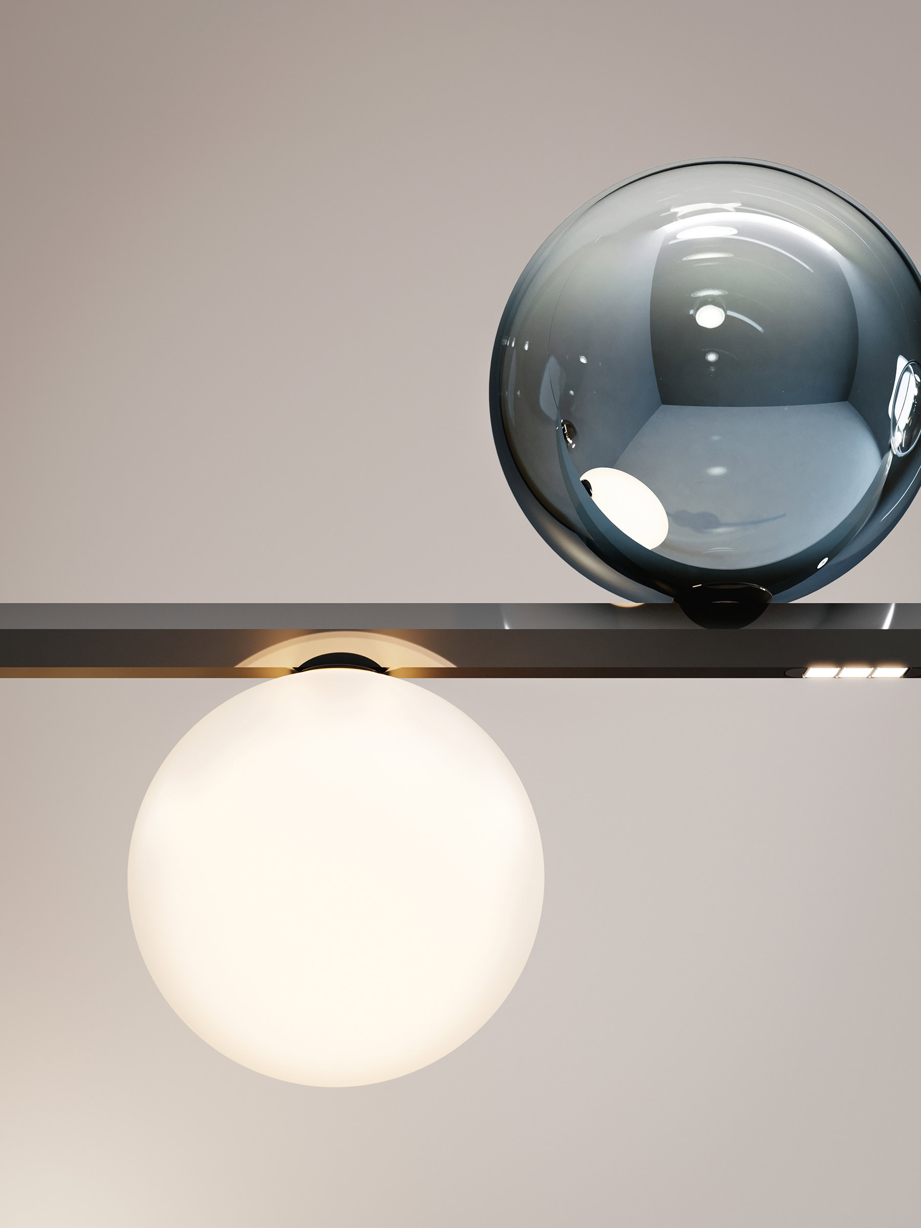 Lodes ha creado un objeto de altas prestaciones colocando ledes en la parte inferior de la barra: esta idea completa la luz que emiten las esferas y garantiza una luminosidad uniforme hacia abajo, ideal para iluminar una superficie subyacente.