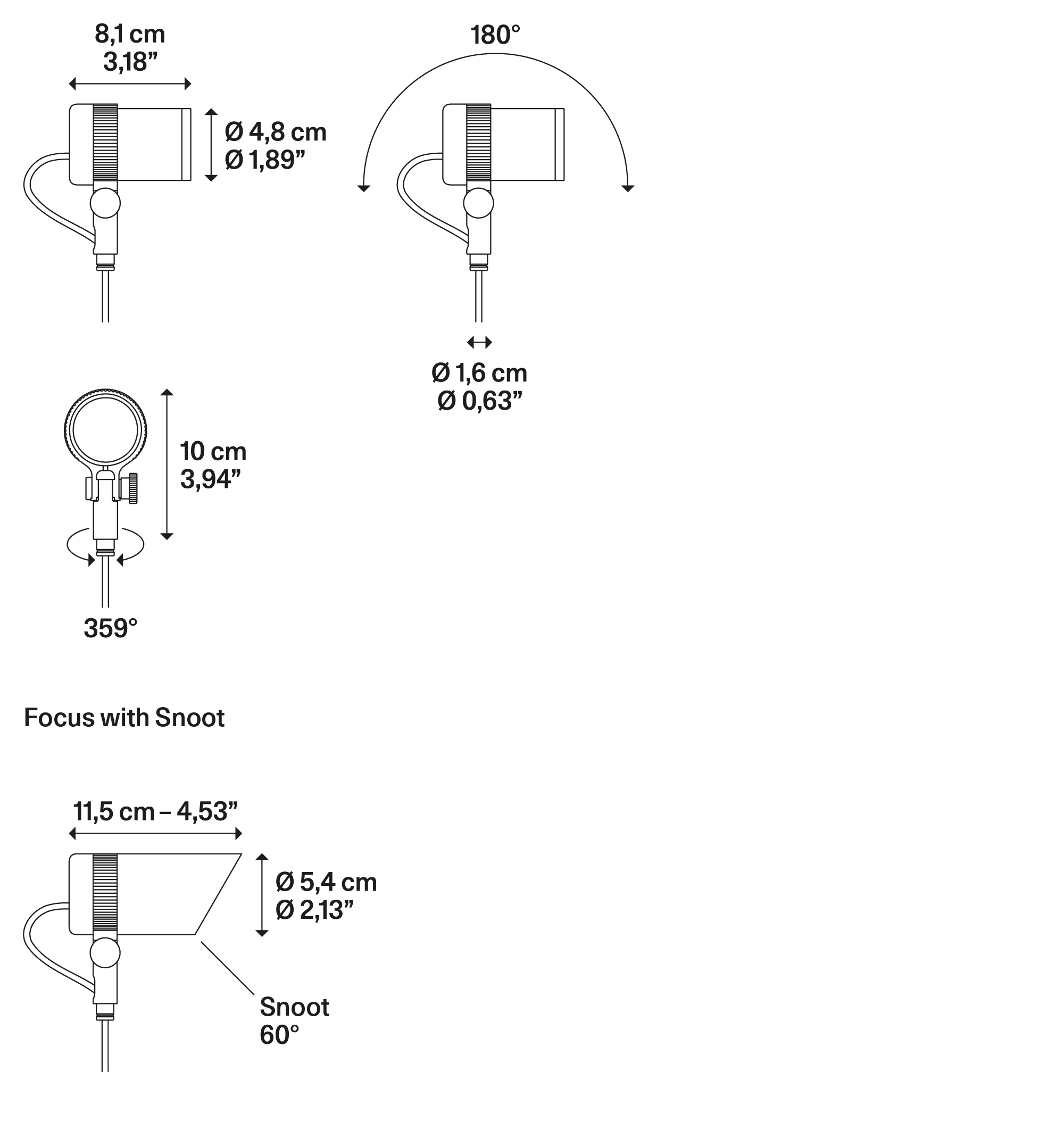 Disponible en trois tailles, le corps de lampe renferme une source LED à haut rendement lumineux qui permet de personnaliser le faisceau grâce aux trois optiques disponibles ‒ Spot, Medium et Extra Wide ‒ pour obtenir des effets spécifiques ou diffus en fonction des besoins de conception. L’effet lumineux peut être davantage personnalisé grâce à des accessoires optiques internes ou externes en option – Honeycomb, Half-moon glare shield, Snoot – qui soulignent le dynamisme du projet et les interactions possibles avec l’utilisateur.