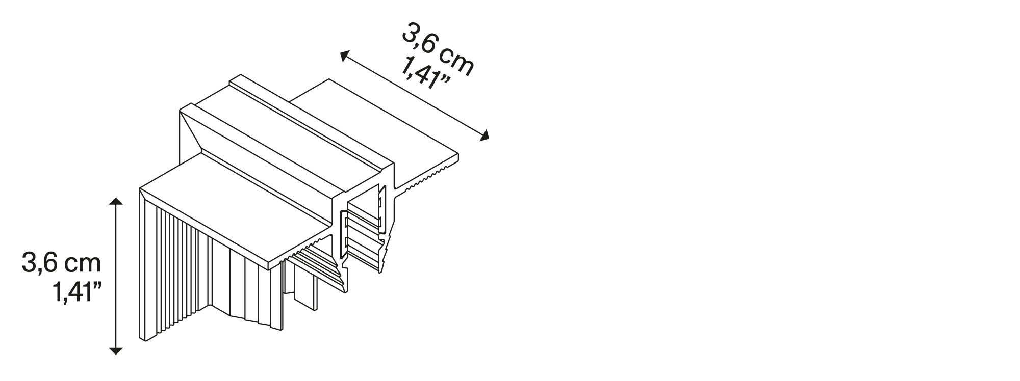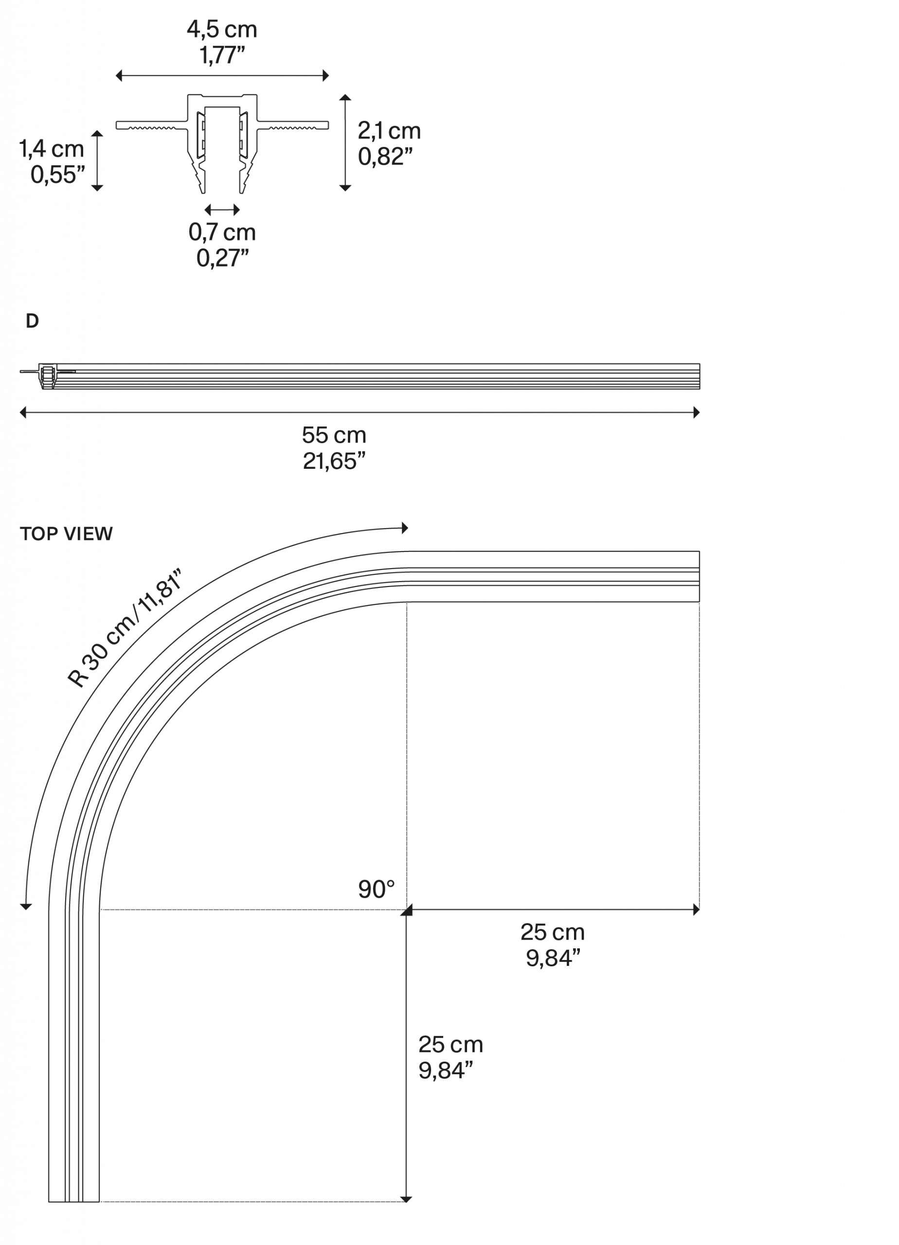 Elemento curvo a 90° – raggio 30 cm ⁄ 11,81” per il binario Trimless Recessed, per realizzare curve sullo stesso piano di installazione. Cover protettiva e cover estetica di finitura incluse.