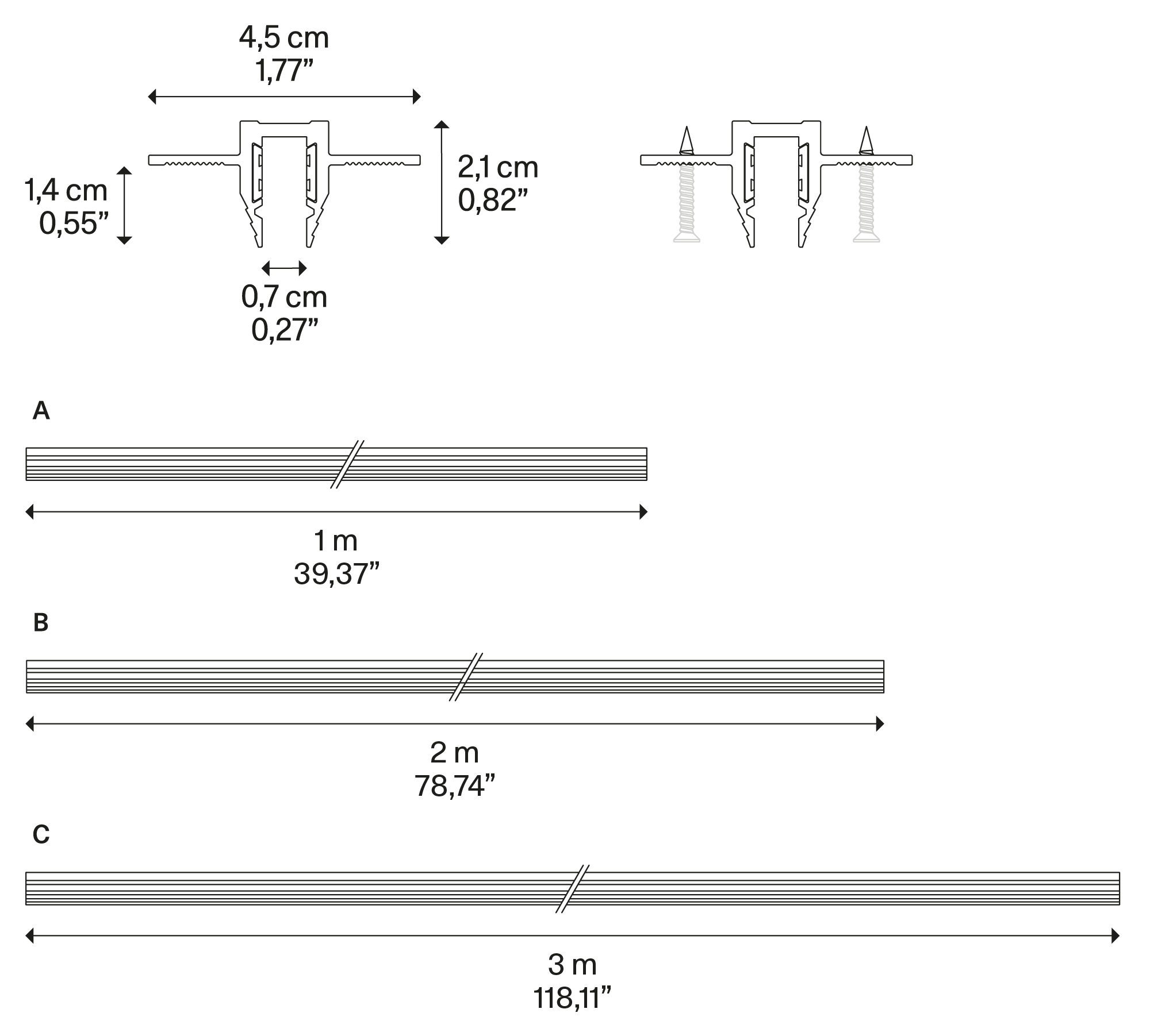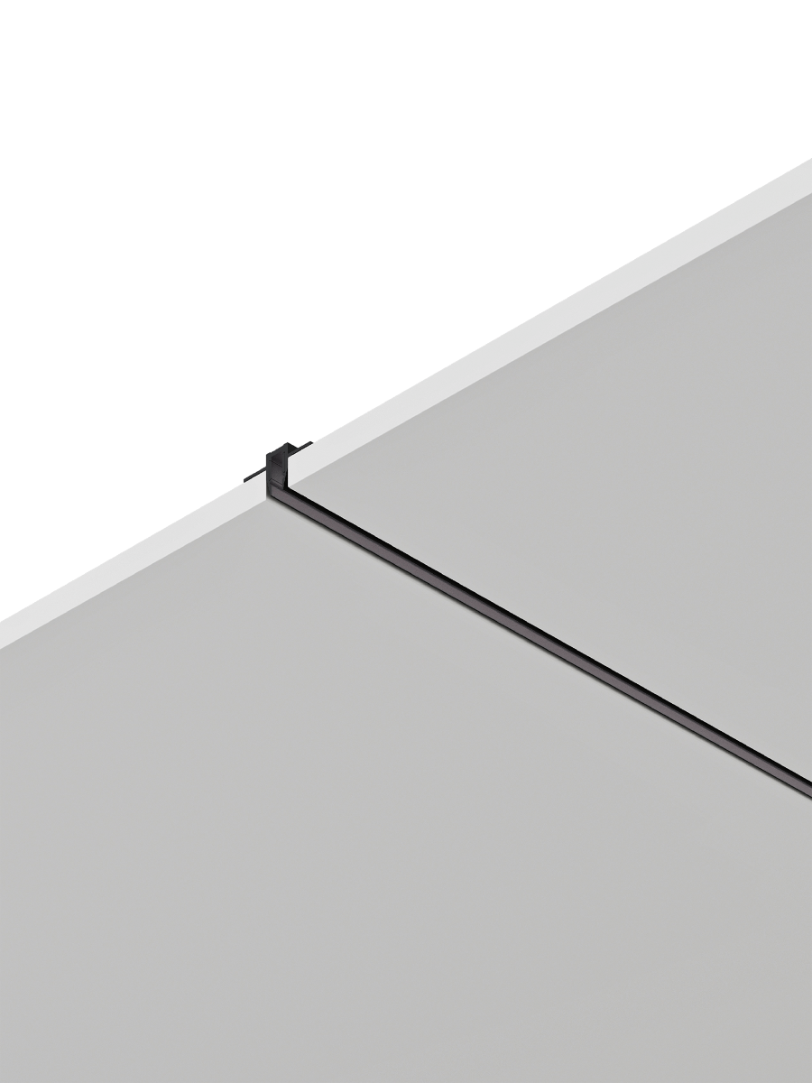 Profilo a binario 48V per installazione ad incasso trimless, disponibile in tre lunghezze. Cover protettiva e cover estetica di finitura incluse.