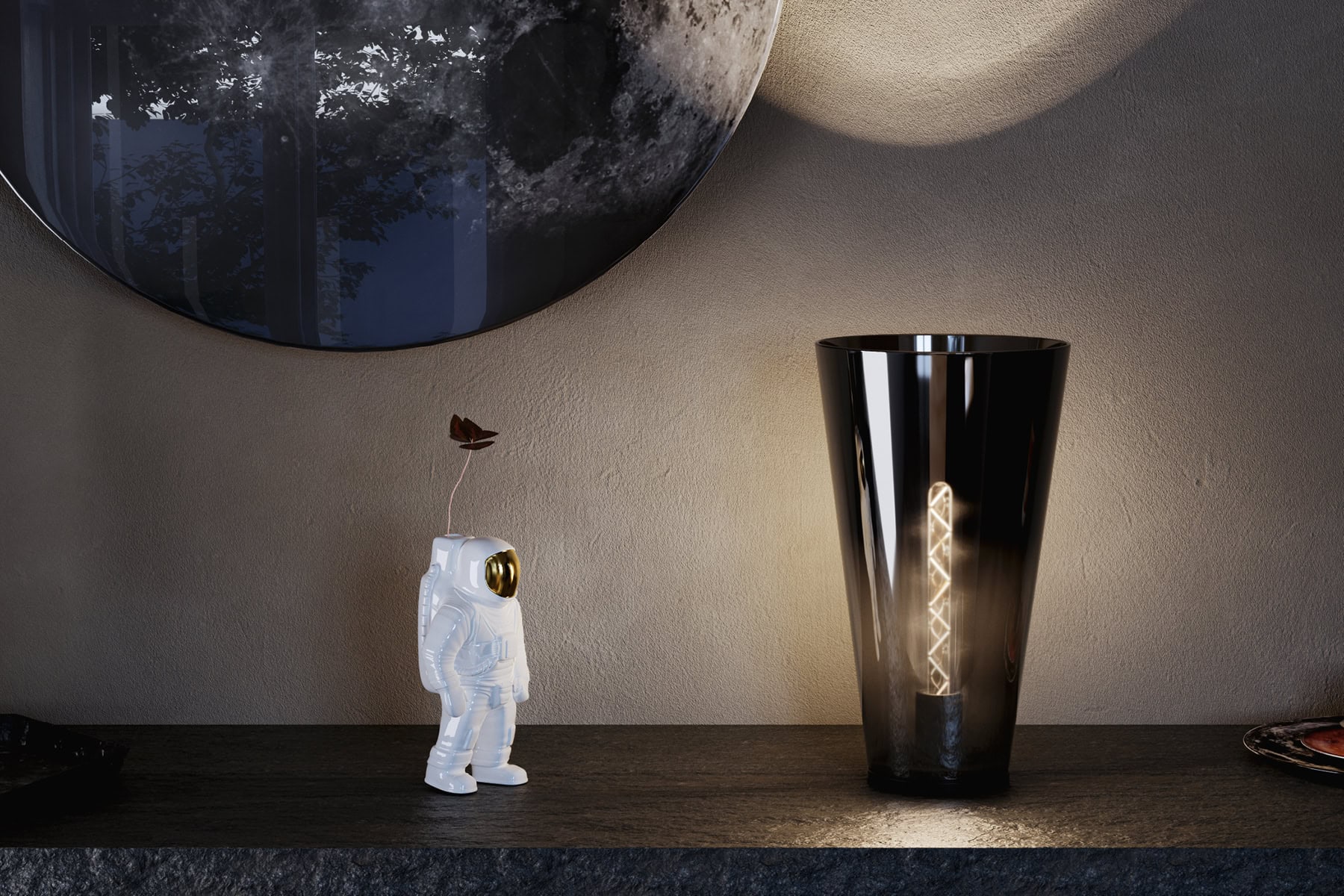 La silhouette conica si allarga dolcemente verso l’alto, come se stesse per diffondere non suoni, ma fasci di luce soffusa ed avvolgente. La colorazione gradiente del vetro aggiunge un tocco di mistero e raffinatezza, il design esplora forme audaci e linee pulite che oggi definiscono il modernismo.