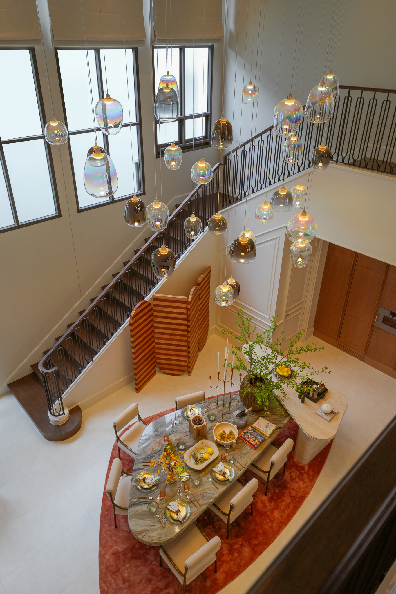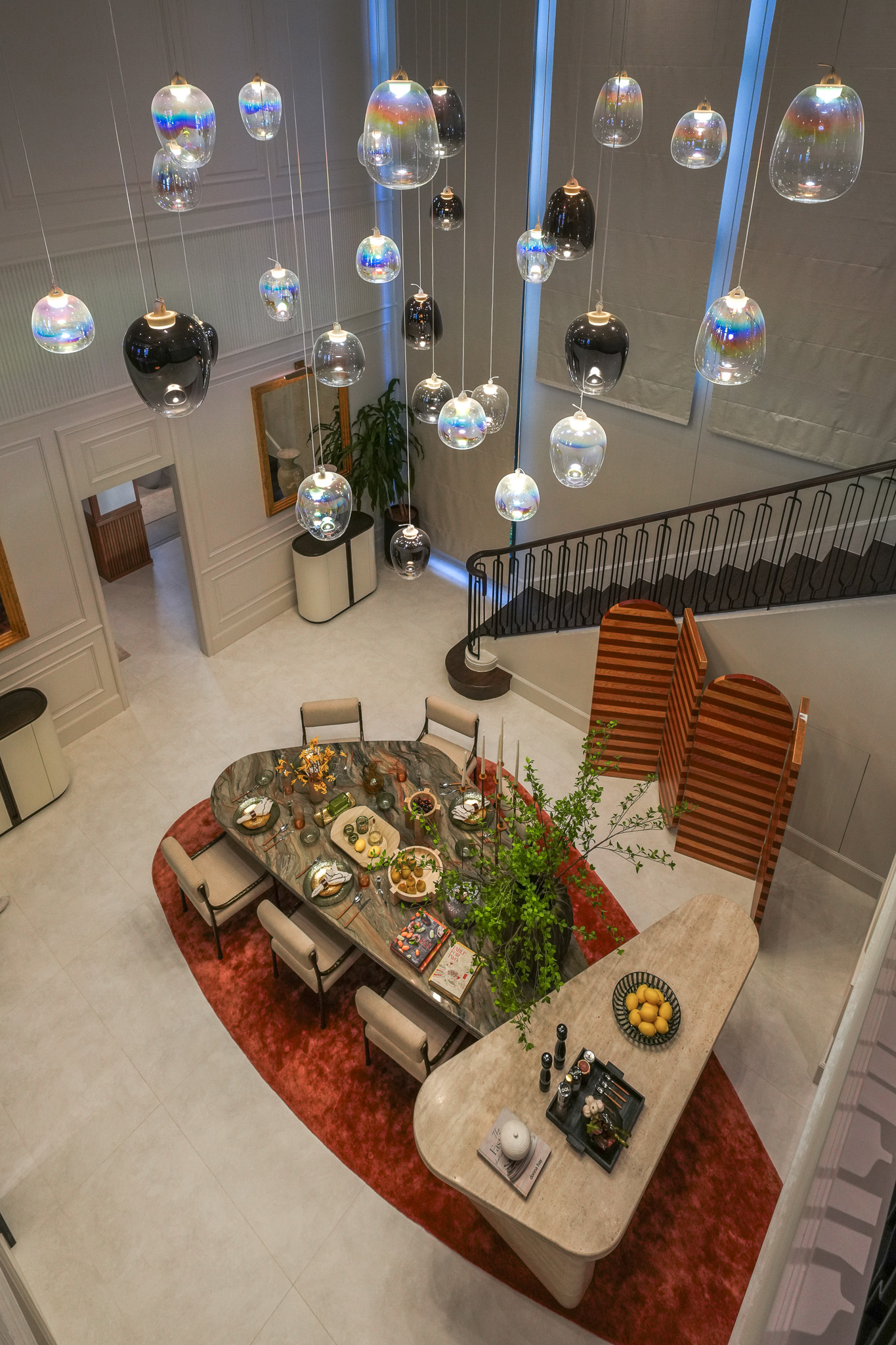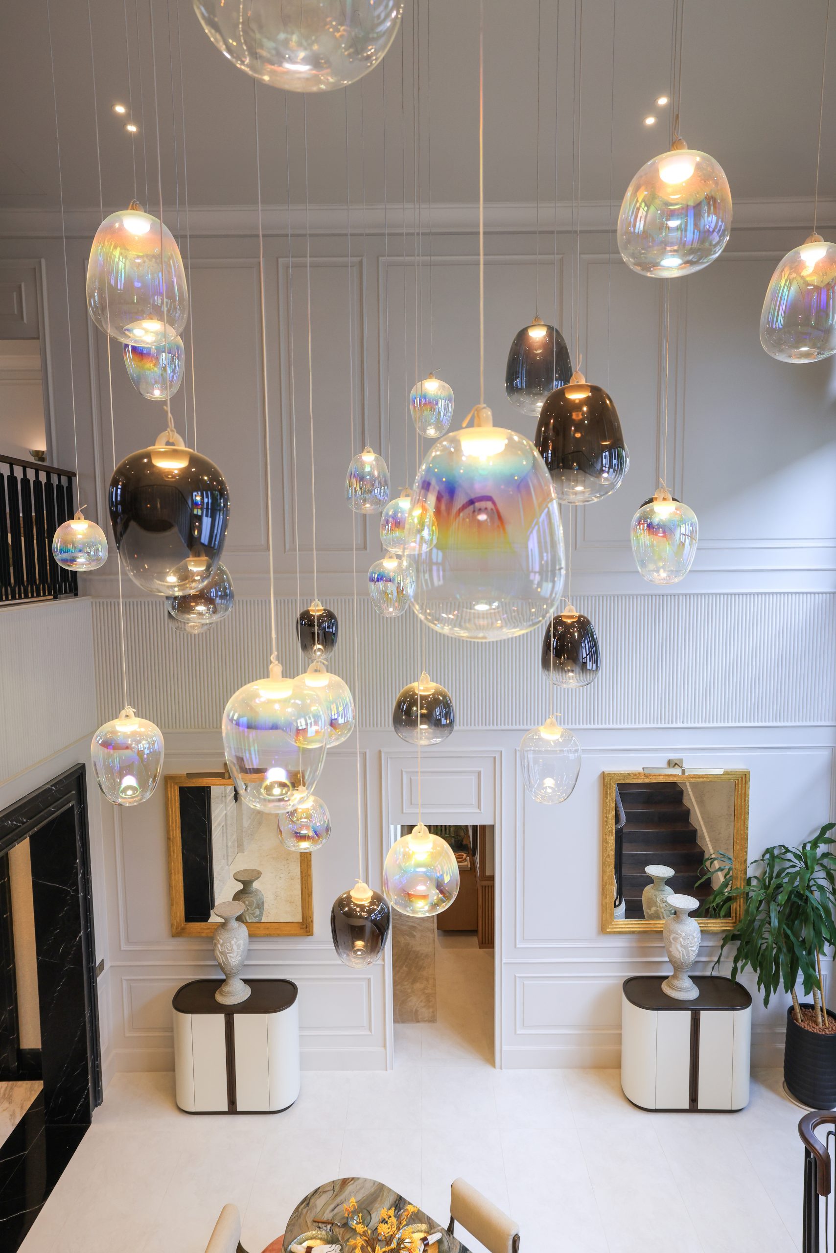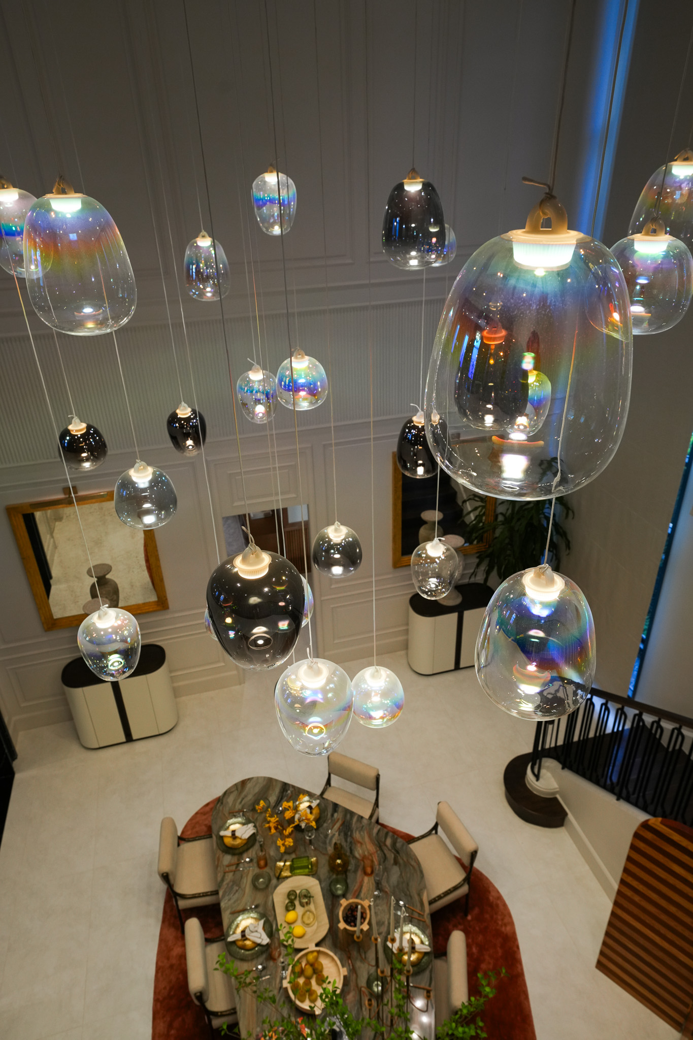 Sopra il grande tavolo da pranzo, una cascata di sospensioni Oblò nelle finiture Rainbow e Glossy Smoke diventa il fulcro visivo dell’ambiente. Le diverse forme e dimensioni si alternano come piccole boe luminose, creando un ritmo dinamico che illumina lo spazio con armonia.
