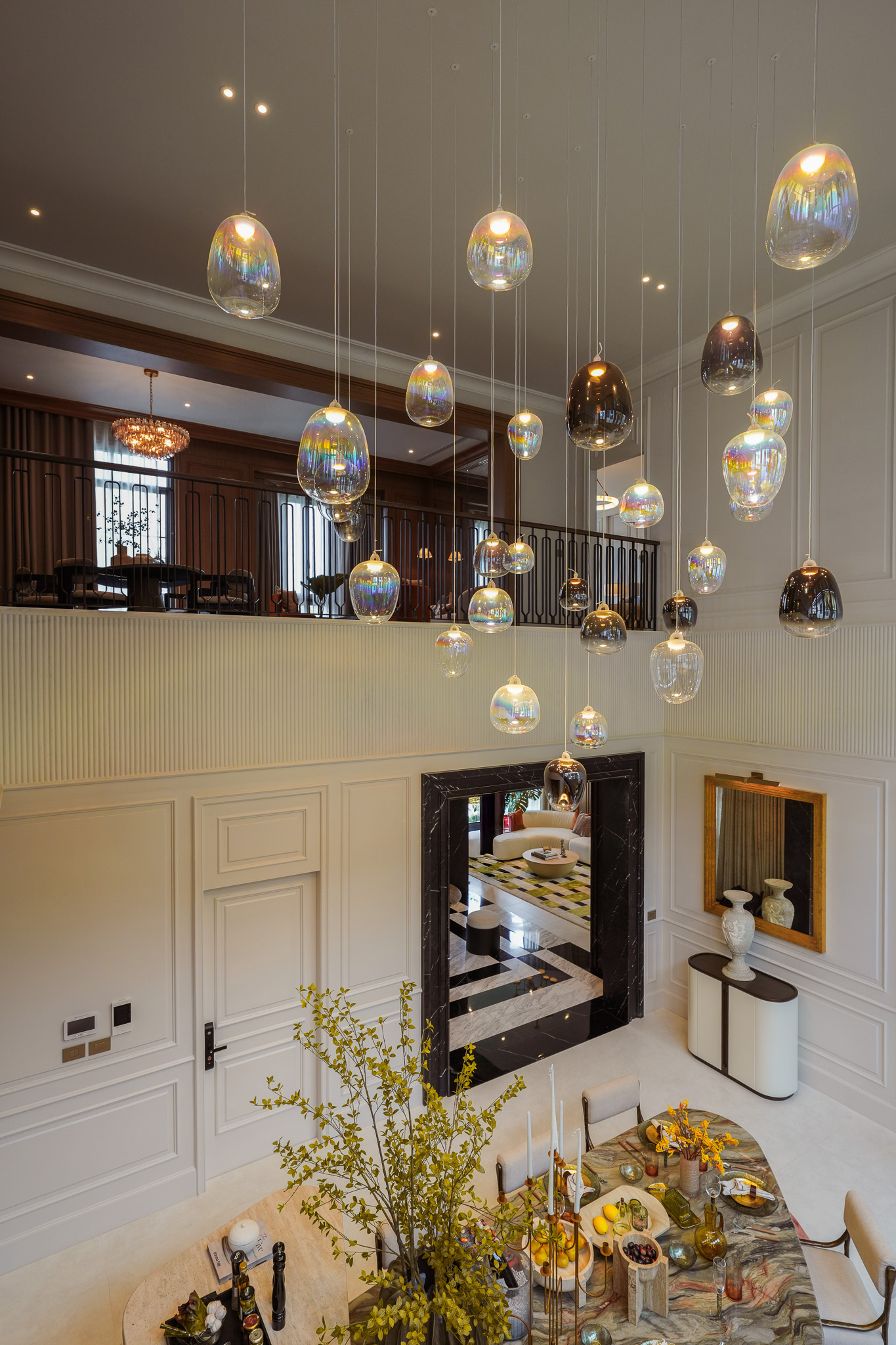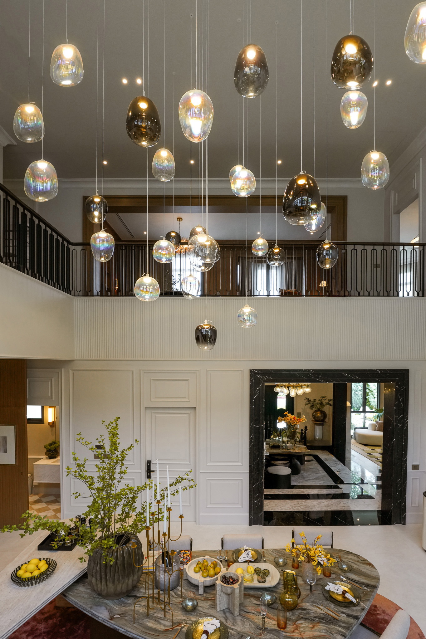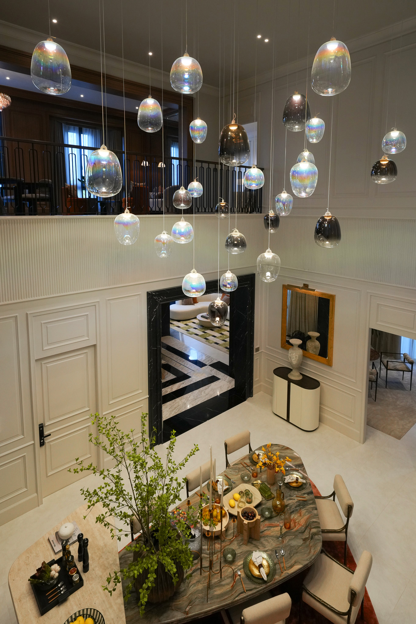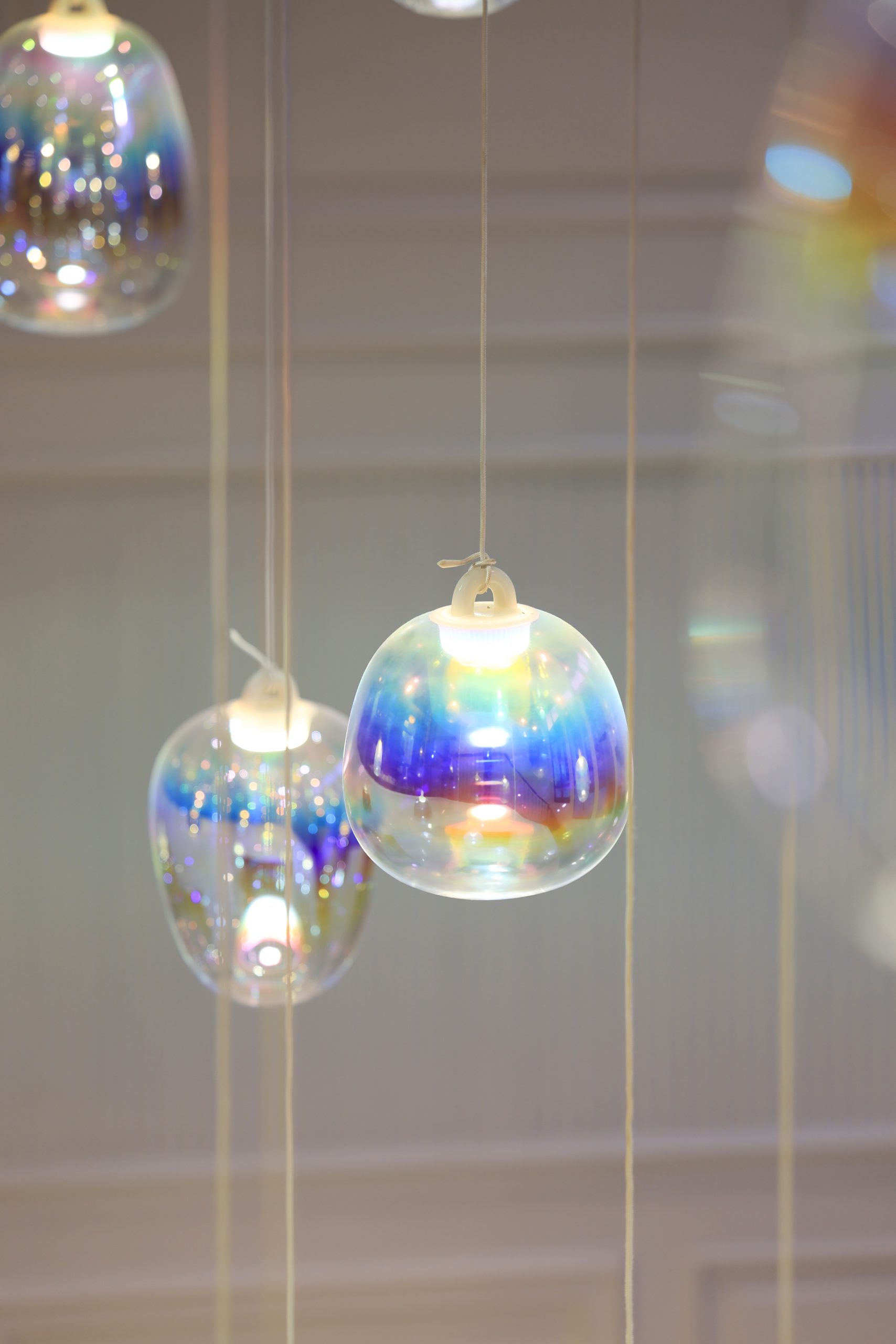 Sopra il grande tavolo da pranzo, una cascata di sospensioni Oblò nelle finiture Rainbow e Glossy Smoke diventa il fulcro visivo dell’ambiente. Le diverse forme e dimensioni si alternano come piccole boe luminose, creando un ritmo dinamico che illumina lo spazio con armonia.