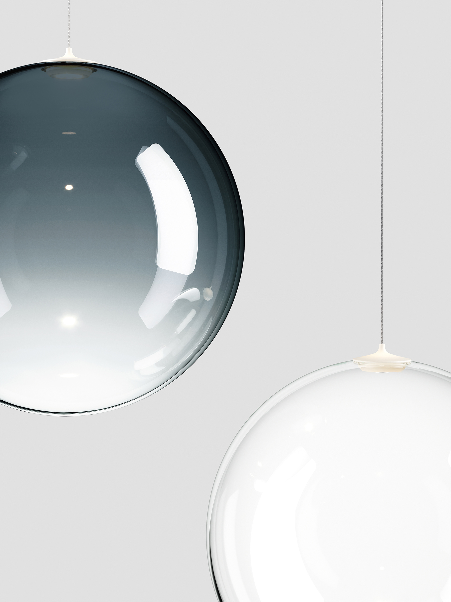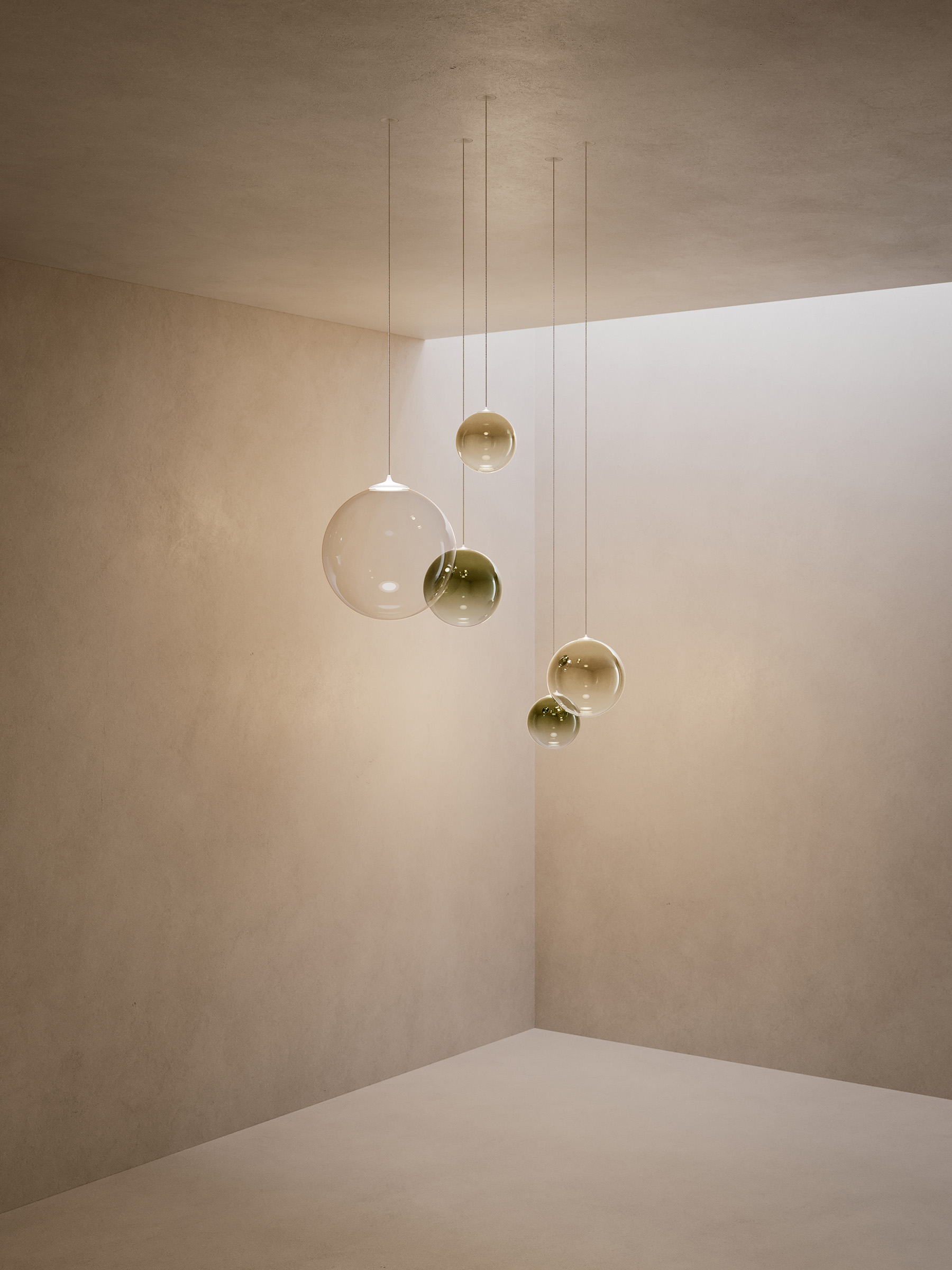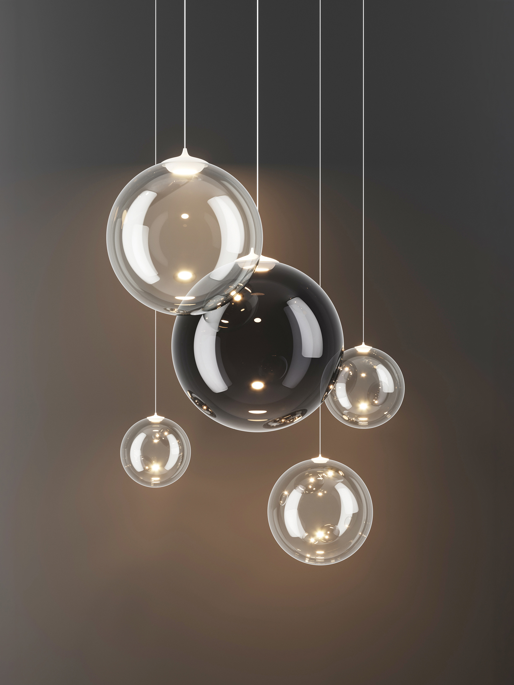 Sei sfere perfette che fluttuano nell’aria come leggere bolle di vetro. Random Solo rivisita il concetto della lampada a sospensione Random separando l’originale cluster a tre elementi e liberando l’individualità delle forme sferiche, che fluttuano come bolle di luce lasciando immaginare composizioni di armonie luminose. Grazie alla nuova sfera da 10 cm, sono ora sei le dimensioni e sette le finiture disponibili, offrendo ampia libertà di arredamento, sia come punti luce sospesi singolarmente che in leggere e vivaci composizioni multiple su cluster.